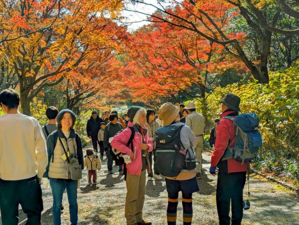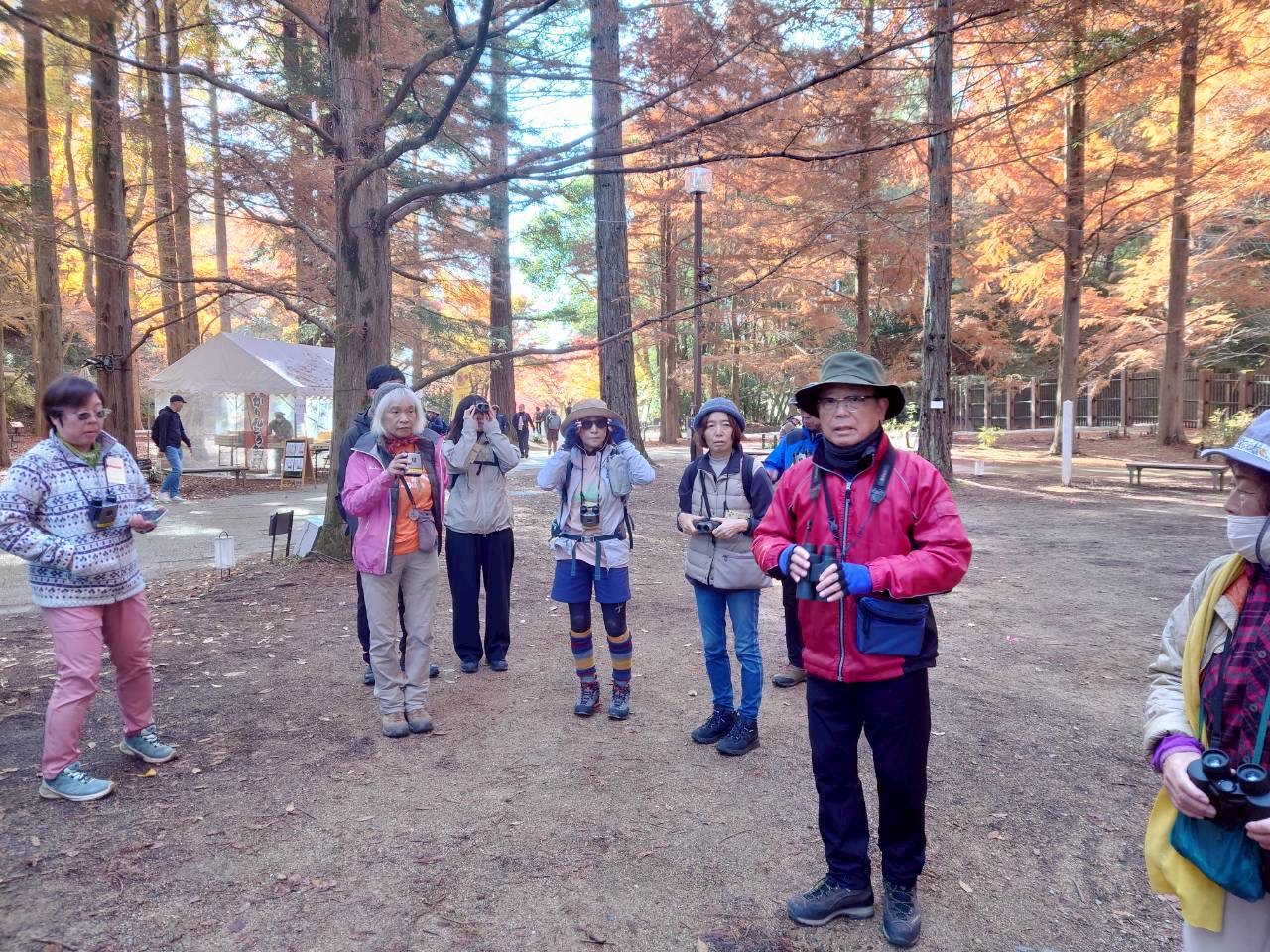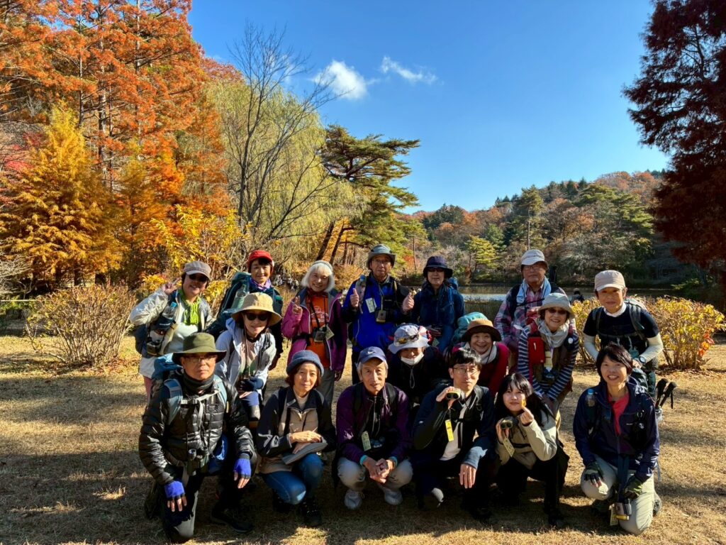 11月末とは思えない暖かな好天で青空のもと、バードウォッチング&紅葉狩りとのんびり楽しい一日を過ごしました。野鳥講座の続編をとの声も上がっていました。