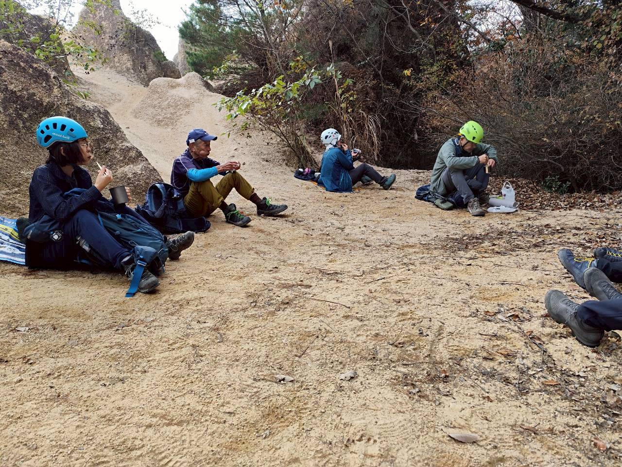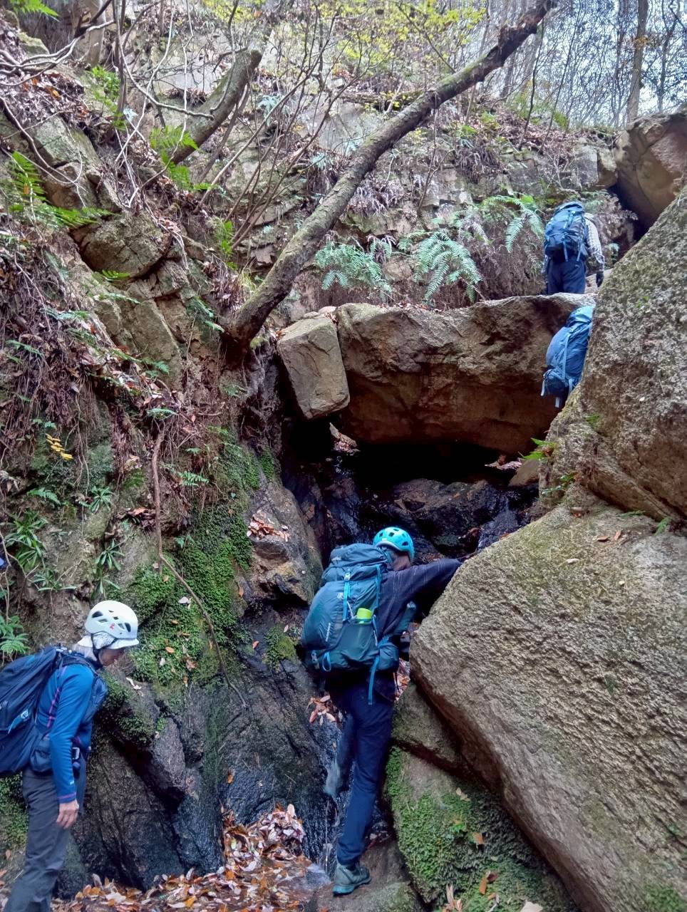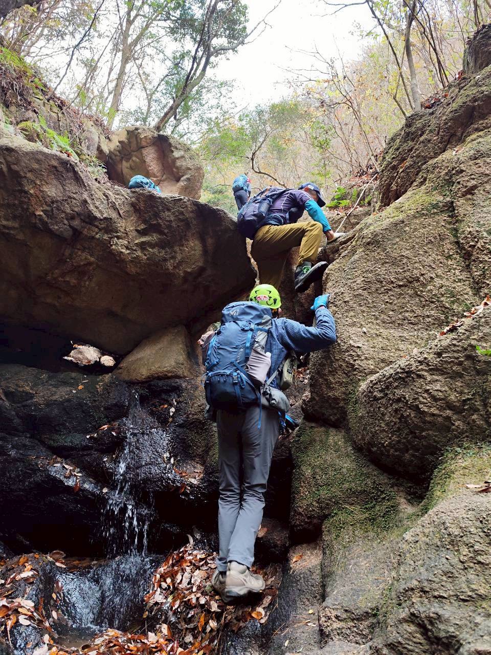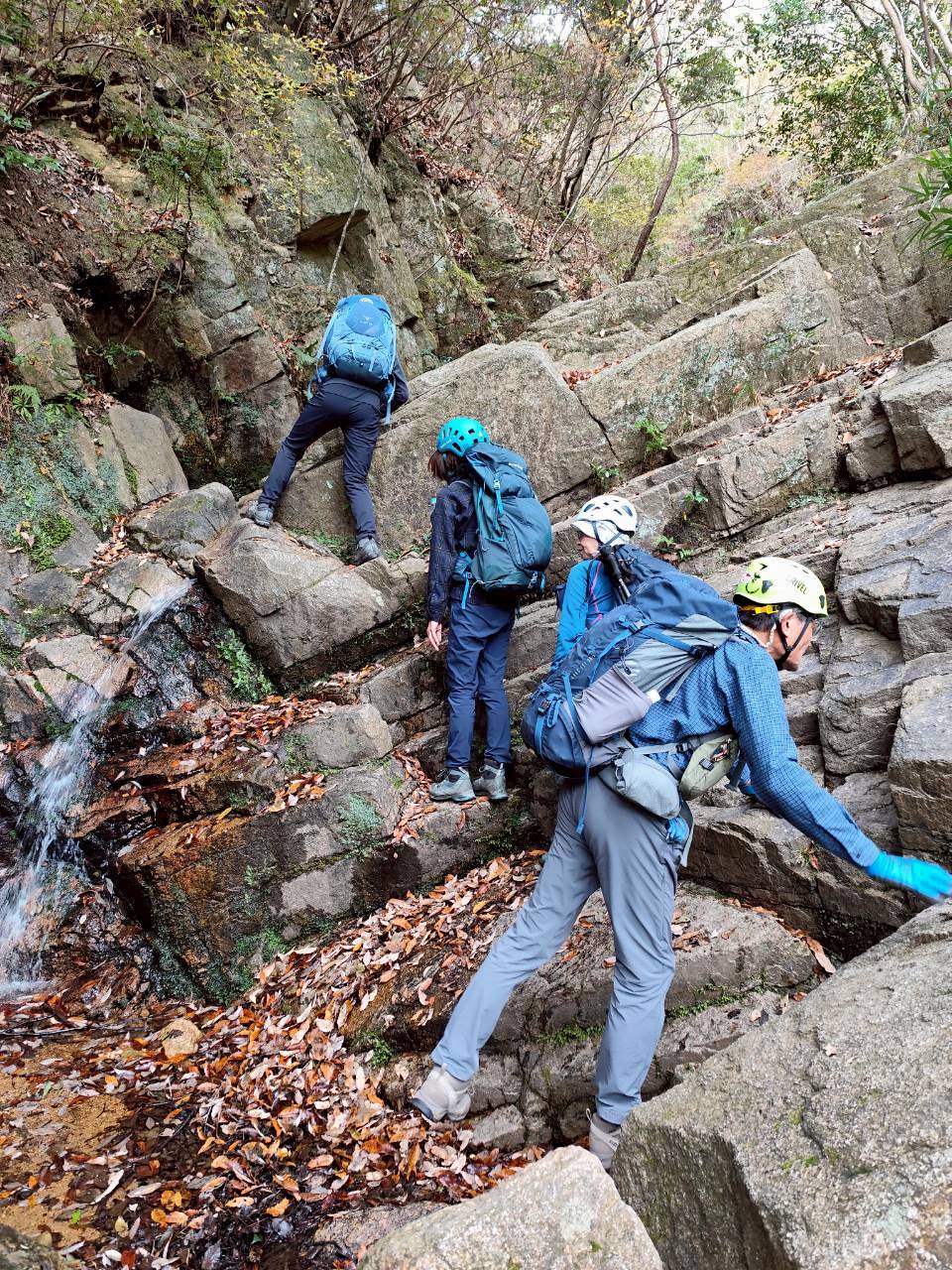 岩場歩きの練習を行いました。阪急芦屋川駅から高座の滝までは通常のハイキングコースですが、そこから地獄谷に入り岩場を登って行きます。濡れていたり苔が生えており滑りやすいコースですが転ばないように慎重に登って行きます。普段より水が少なめでしたが、枯れ葉が沢山落ちていて滑りやすい状況です。
