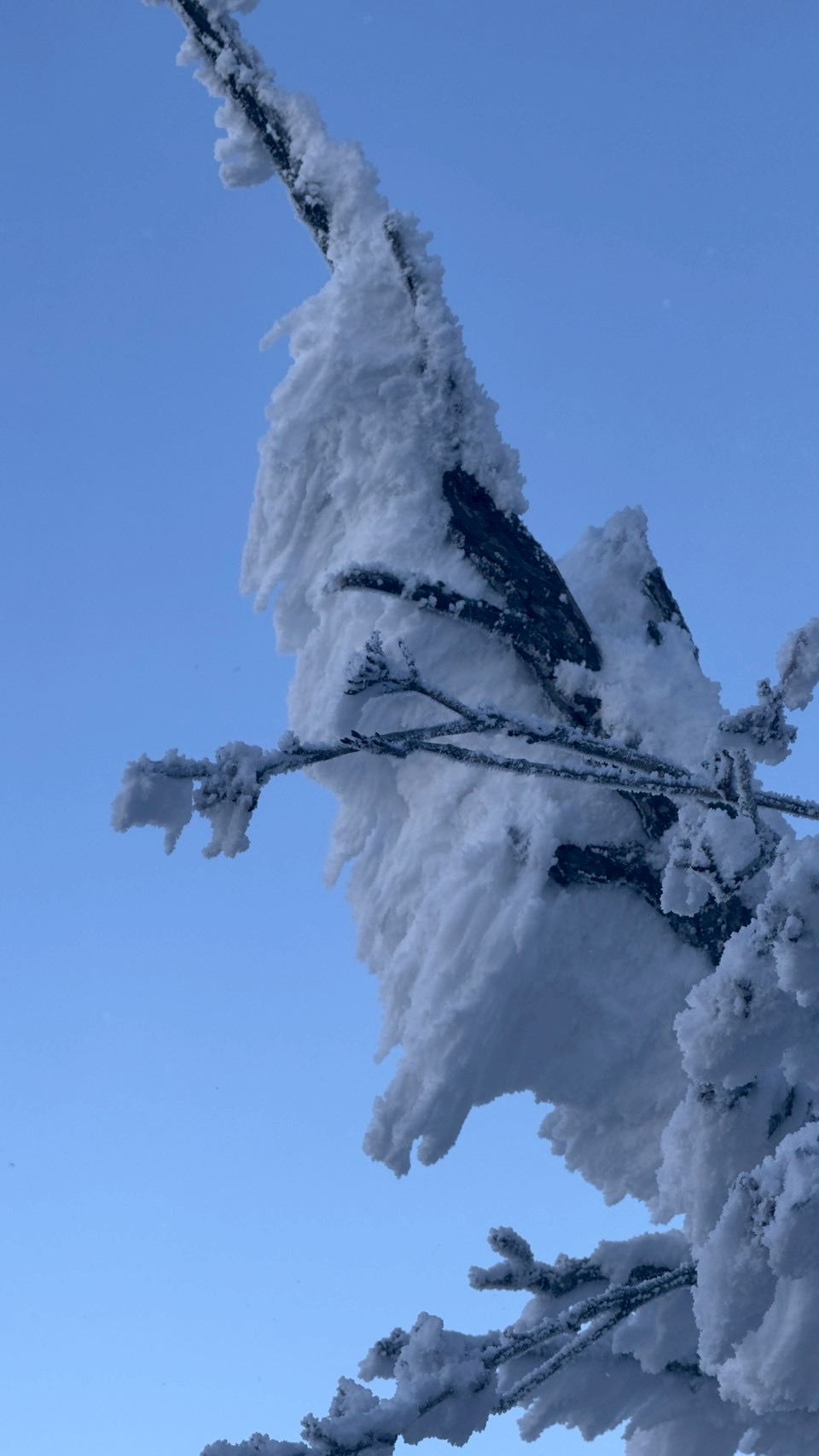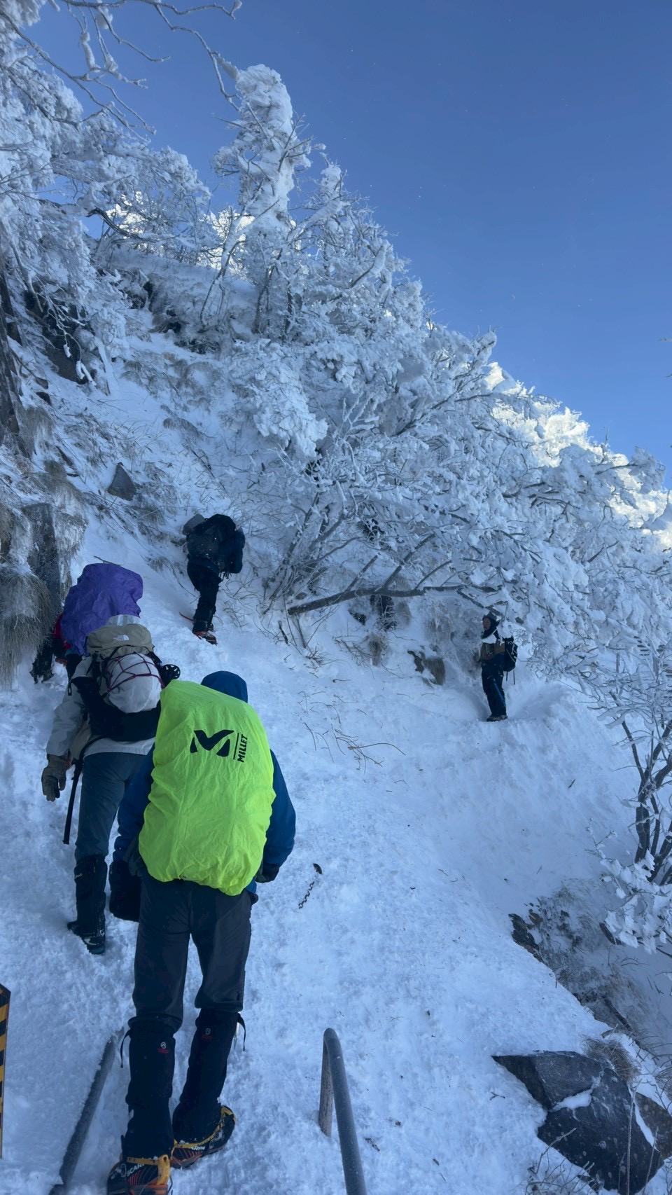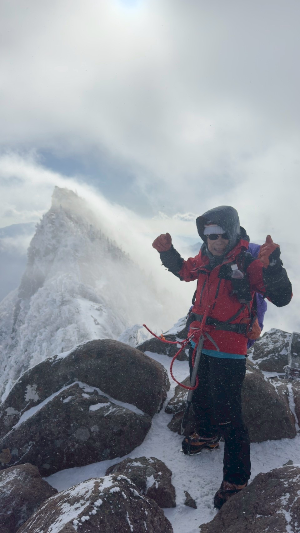 日曜日はアイゼンを付けてスタート。途中からピッケル⛏️に持ち替えて、強い風に消されたトレースを探しながら、ラッセルで登る。少し危なそうなトラバースも問題なくクリア。