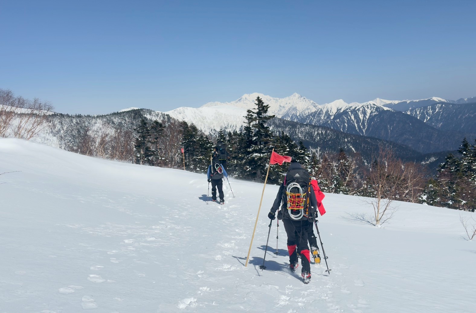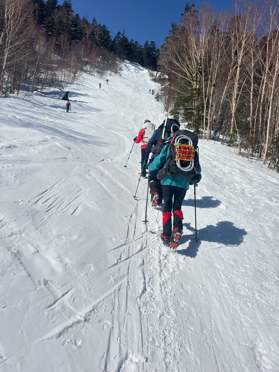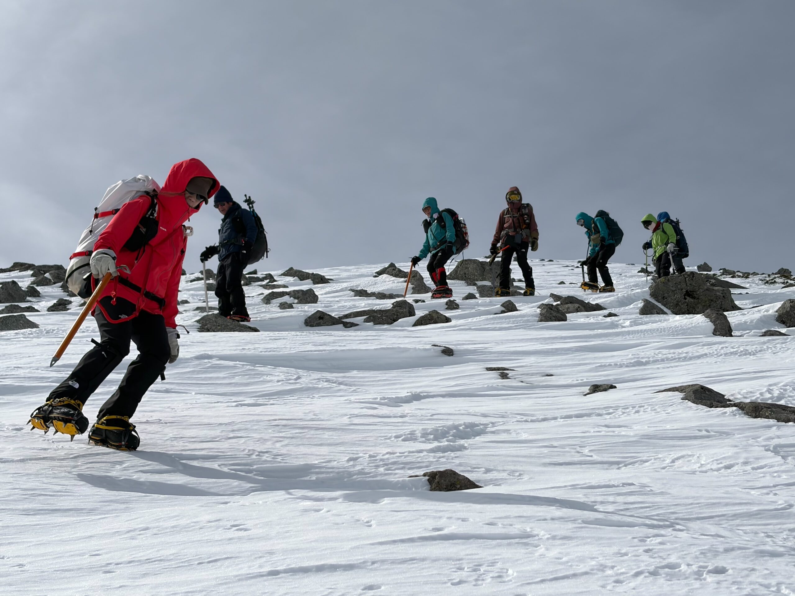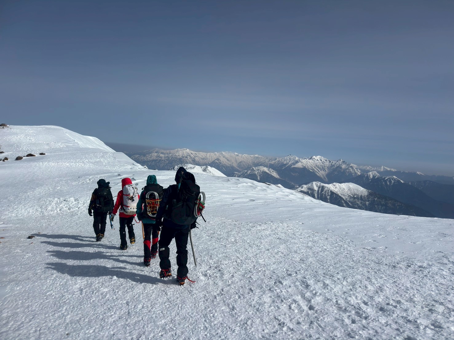 2025年度雪山登山教室修了後の第1回目の雪山登山として、乗鞍岳に挑戦。登頂の日は前日の強風も弱まり、広大な雪渓、北アルプスの山々や御嶽山など周囲の雪山の美しい景色を堪能できた。午後から天気は下り坂だったので本当に幸運だった。下山中、雪渓を歩いていると、突然のけたたましい轟音に”雪崩か!”と肝を冷やすというハプニングがあった。(実はジェット戦闘機が猛スピードで稜線をかすめるように飛び去った音であることが2機目で判明)今回、雪道は迷いやすく慎重な判断を要することを身をもって経験。また、雪崩の痕跡を見たり、参加者の直前キャンセルによる役割変更にもチームワーク良くスムーズに事が運んだことなど、いい経験をさせて頂いた。