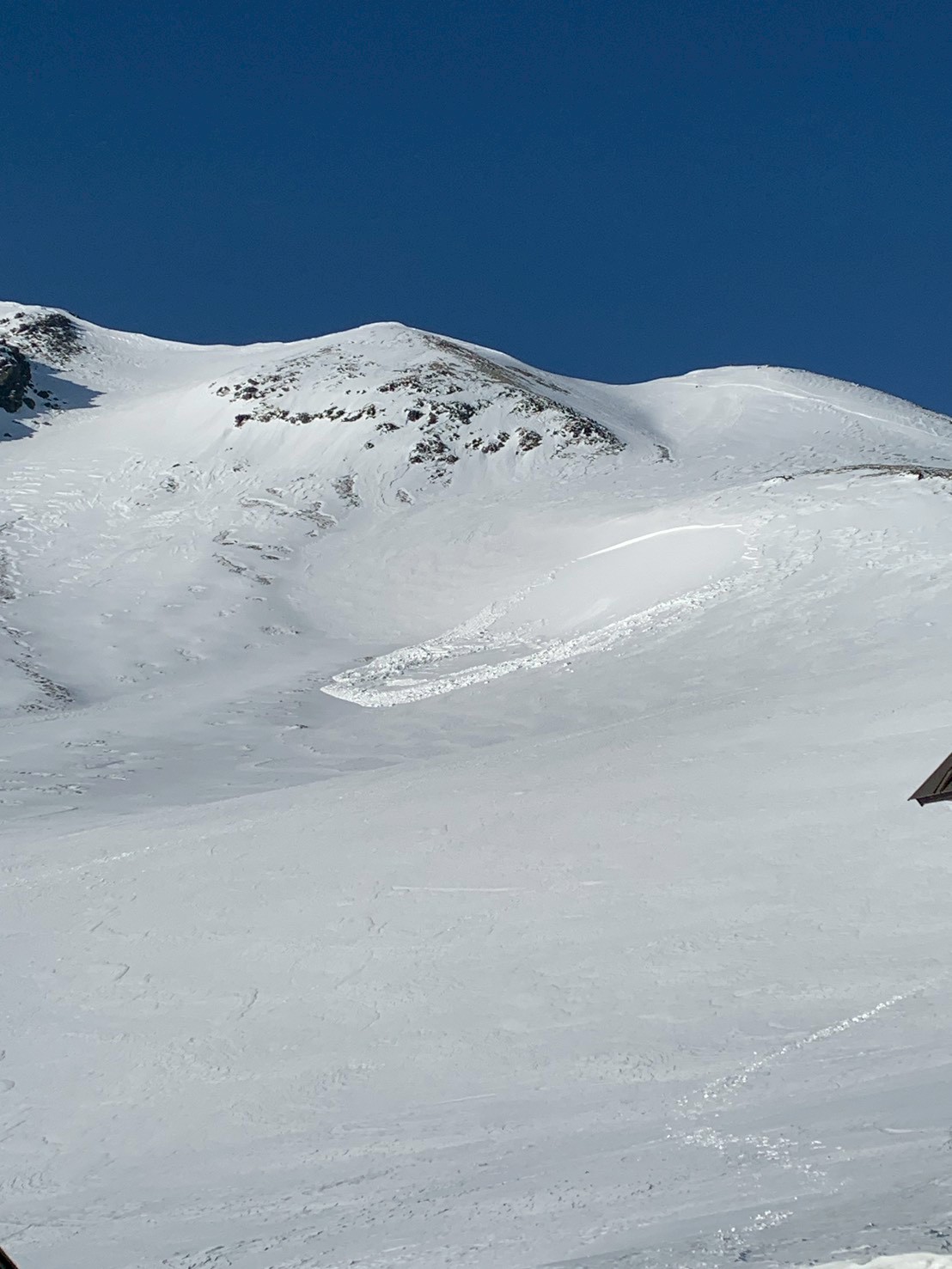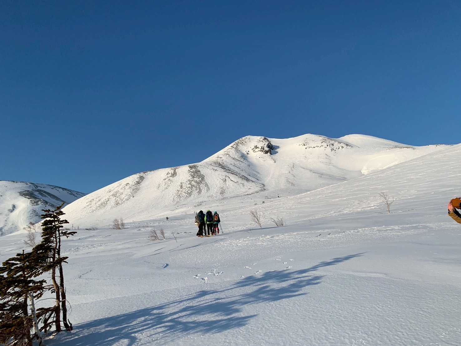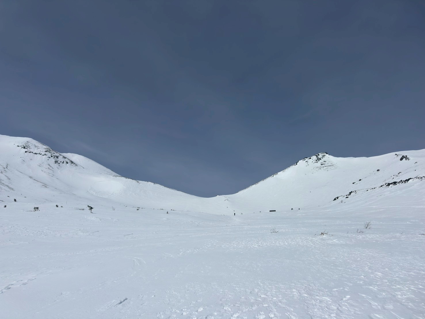 目の前に美しい雪山が広がる。この後、山荘に下る。せっかく登ったのに。