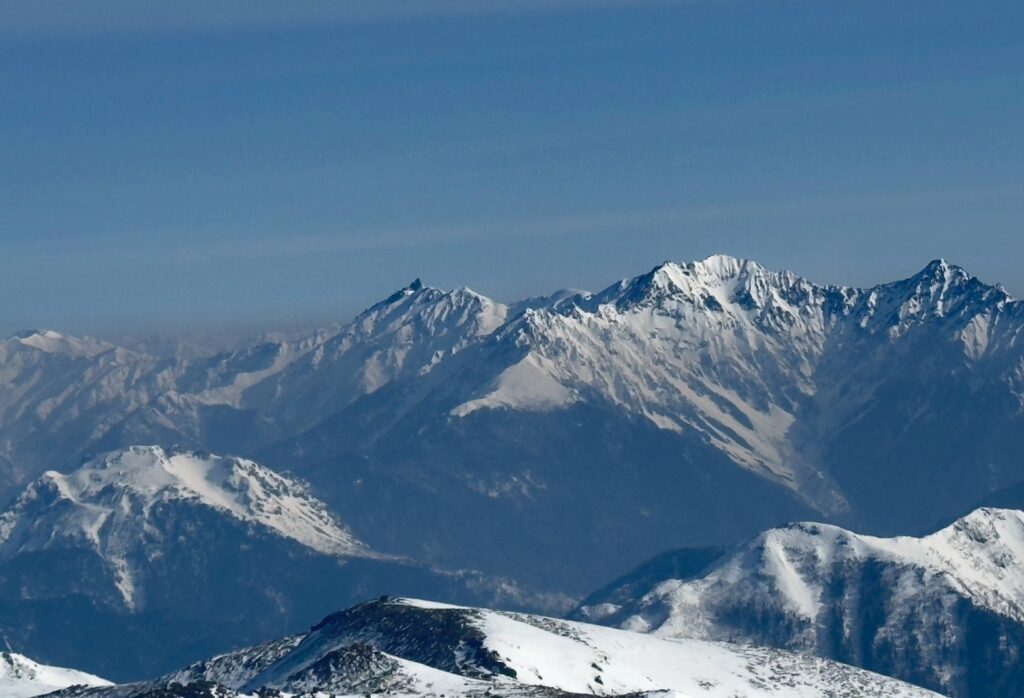 振り返ると、眼前に北アルプス連峰が広がる。真ん中の奥が穂高連峰。