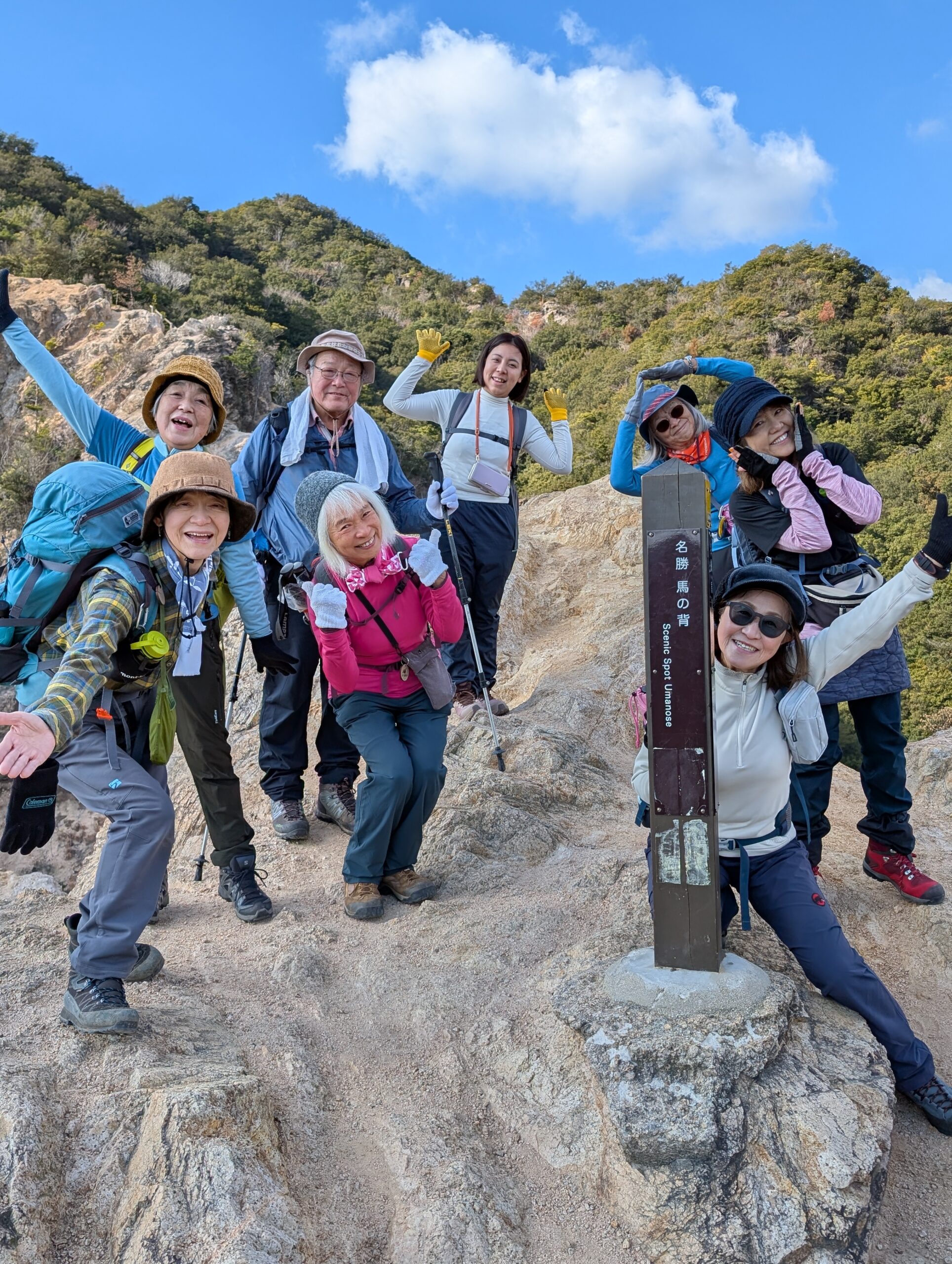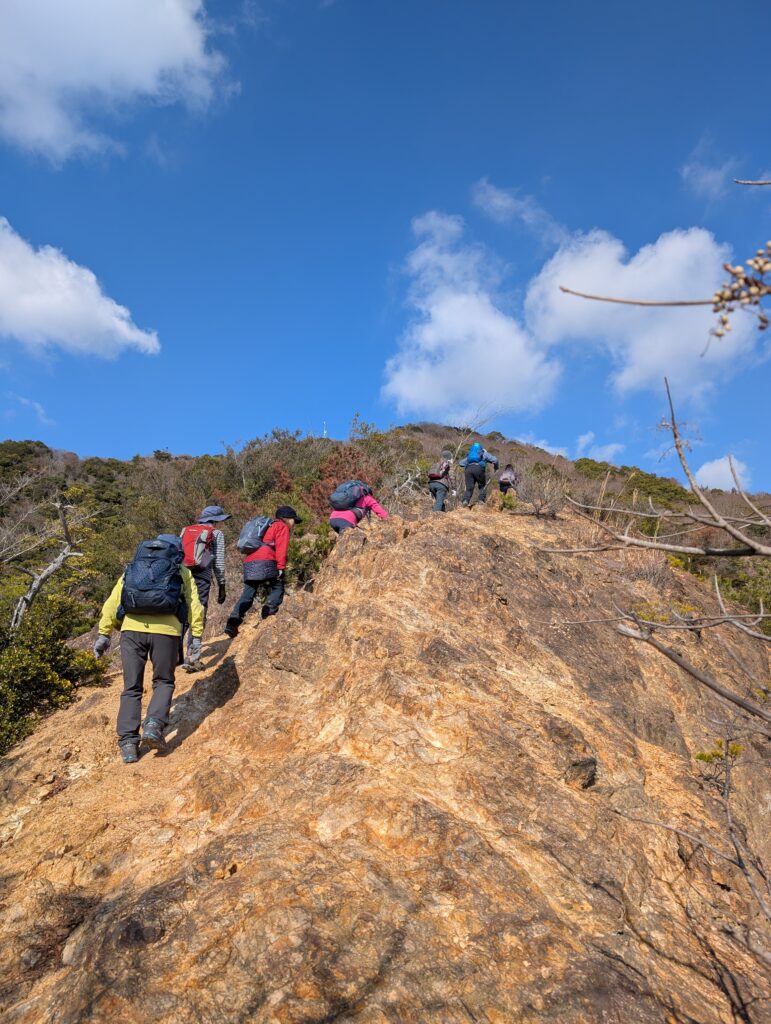 露岩尾根~高取山 投稿日: 2026年1月9日 7:08 AM icchan 板宿の北、禅昌寺からの露岩尾根の一つを上りました。尾根は3つあるそうです。 日時:2026年1月7日(水) 晴れ 参加者:男性1名 女性8名 計9名 コースタイム:妙法寺駅9:30〜野地菊の丘〜横尾山10:49~ 馬の背〜東山11:33〜禅昌寺バス停〜昼食〜露岩尾根〜13:43 高取山西峰〜14:01高取山(荒熊神社)~高取神社~登山口15:00 馬の背で 高取神社の上からの絶景 お天気が良く、山登りにちょうど快適でした。高取神社もこの日は頂上まで登り、石碑の並ぶ神社の趣を感じ、山上からの絶景を楽しみました。 📂投稿グループ 山行報告