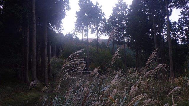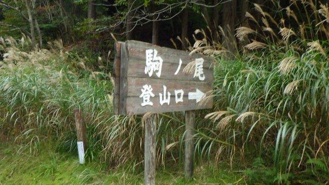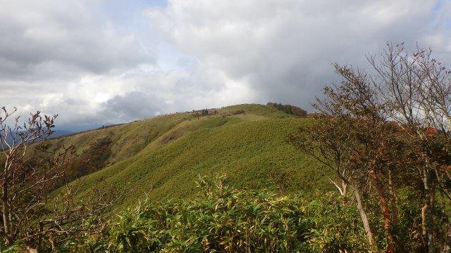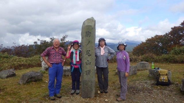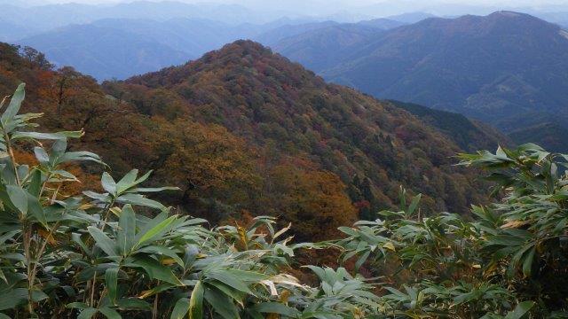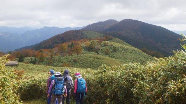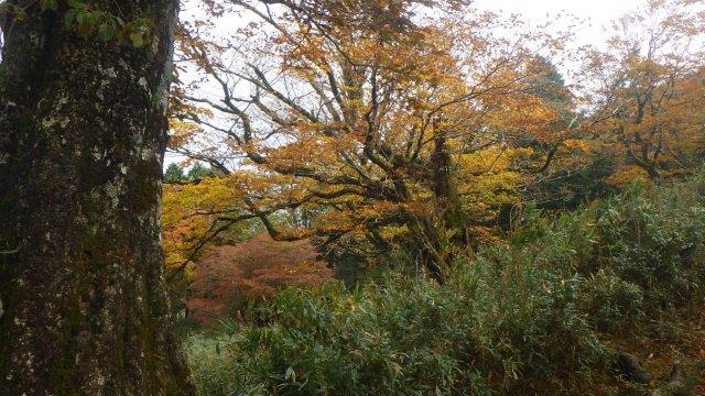 駒の尾山登山口から大海里峠までは少し斜面になっており、杉の間から紅葉が見え隠れしています。大海里峠からは、良く整備された登山道に、枯れ葉が積もり、両脇には紅や黄に彩付いた木々が続いたり、笹原の向こうにのびのびとしたはなだらかな稜線みえたりと、のんびりした秋の日を楽しめました。