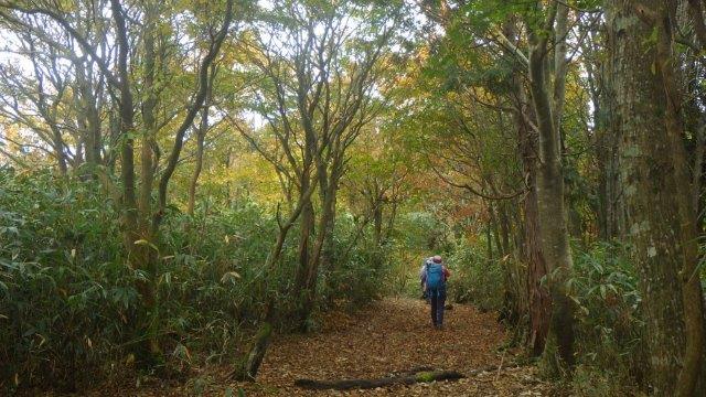 駒の尾山登山口から大海里峠までは少し斜面になっており、杉の間から紅葉が見え隠れしています。大海里峠からは、良く整備された登山道に、枯れ葉が積もり、両脇には紅や黄に彩付いた木々が続いたり、笹原の向こうにのびのびとしたはなだらかな稜線みえたりと、のんびりした秋の日を楽しめました。